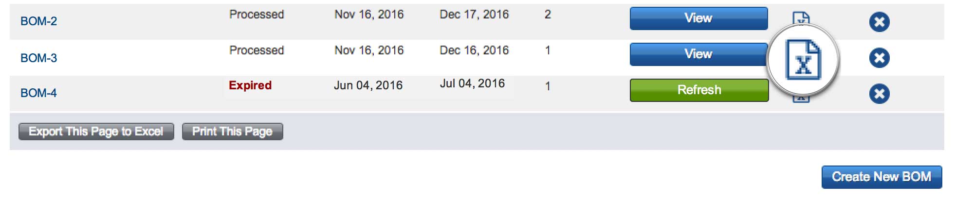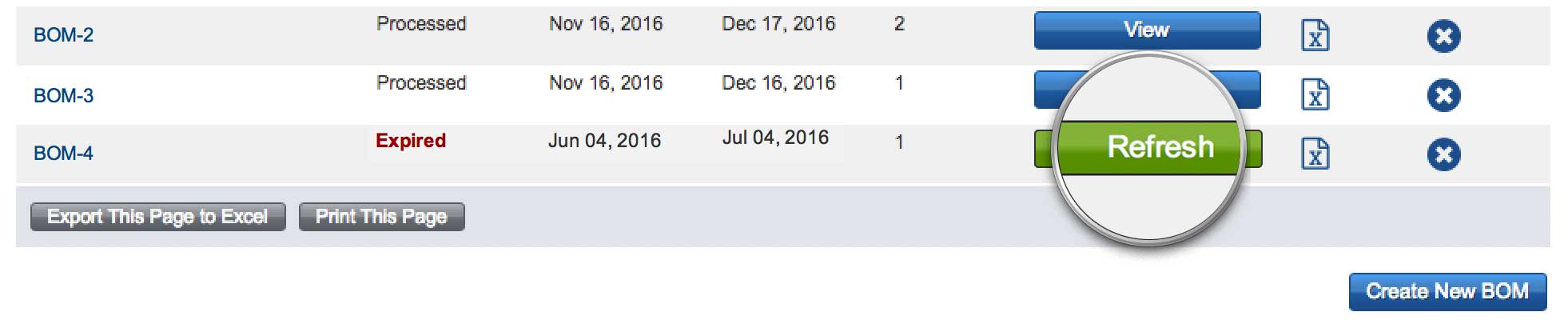 Después de 30 días, el precio cotizado para su BOM caducará y deberá actualizarse. Seleccione el botón "Actualizar" para cualquier BOM vencida a fin de volver a procesar los datos y cotizar un precio nuevo.